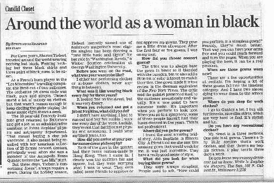 In this 1998 article from the Baltimore Sun, horn player Sharon Tiebert is profiled in their Candid Closet column about life and clothing after leaving the touring company of Les Miserables and settling into her new job at Johns Hopkins University. Click on the icons below for the story and photo (and our apologies for the poor quality and legibility).